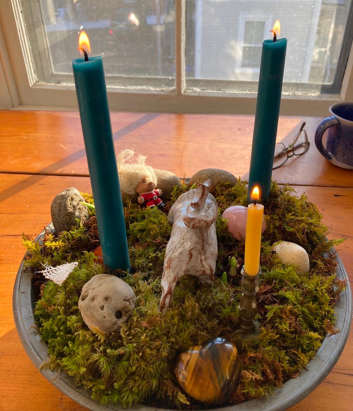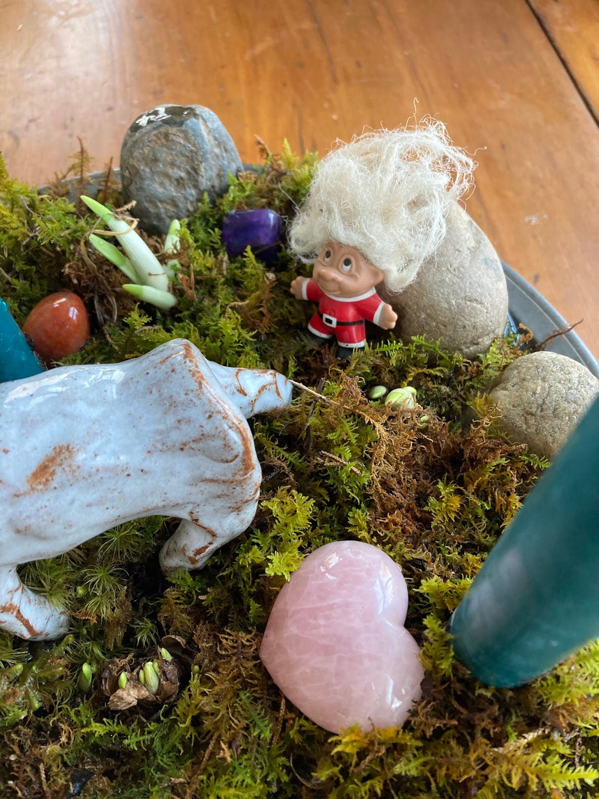 In the above verse, each Sunday of Advent is focused on a different “kingdom”— mineral, plant, animal, and human. I think it could be fun to add in these elements to your centerpiece as the weeks go by, so that on 3rd Advent maybe a feather appears, or a toy horse, etc. Or you could just throw some gnomes in and let them have the run of the place from the start!