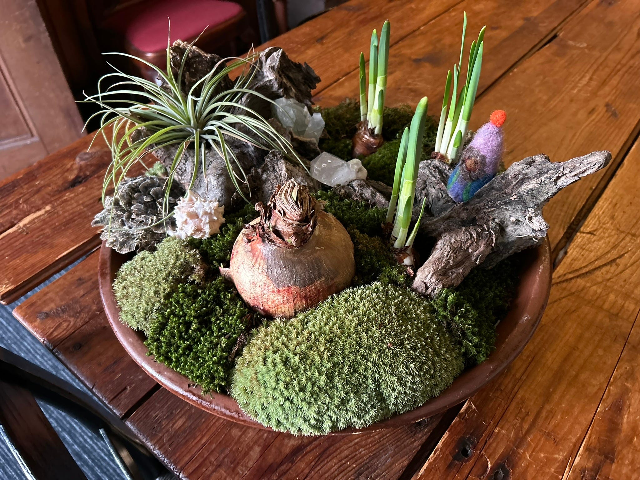 In the winter the indoor forcing of bulb flowers can be a beautiful thing to integrate into the display. As seen above, I used a bowl and layered the bottom with gravel, then planted a few paperwhites into potting soil. I then added moss (purchasable for a few dollars at a florist shop, if you can’t find any in nature) to create a velvety floor.